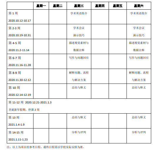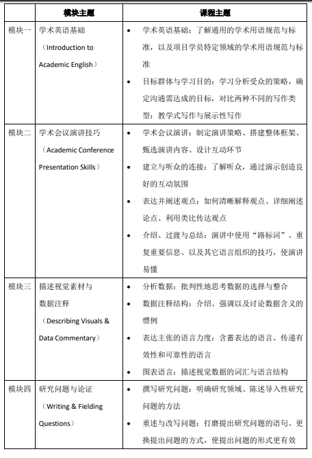 (2)国际学术论文的写作学员们将分析不同学术领域的样文、论文以及他们自己的文章,探讨与练习使用修辞句式,来组织演讲语言、表达学术观点、确保观点清晰、语句顺畅、前后连贯、风格统一、语法准确、结构缜密。此外,学员们将有效扩充通用及专业性的学术讨论词汇,学习通过有序的语言方式,准确表达观点和信息,并通过有效的过渡和转换句法,来展现不同观点之间的关联。