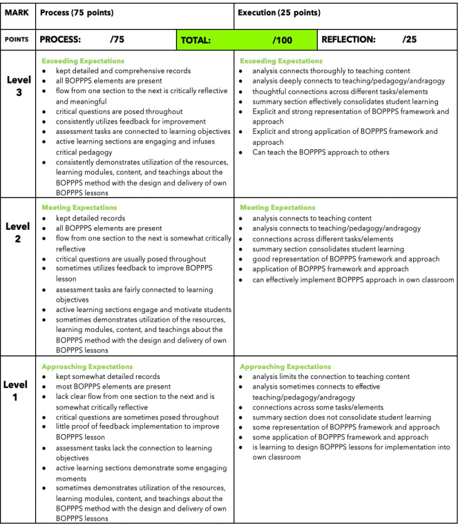 Presenter: Sujoy Gupta Part 1- English Coaching (7:00-7:30 pm) Presenter: Joel Hartling (7:30-9:30 pm) Part 2 Topic: Piecing it All Together- Connecting the Assessment with the Learning and Outcomes and the Active Learning Tasks to the Assessment • Designing assessment tasks and learning activities with the BOPPPS learning structure based on previous participant lesson plans- steps for assessment design, types of assessment and learning tools and methods applicable and effective in higher education a) Formative assessment b) Summative assessment c) Criterion-referenced assessment d) Alternative assessment e) Authentic assessments f) Performance assessments • Developing marking schemes- examination of exemplars and examples • Providing effective feedback • Choosing appropriate tools and methods- tips and techniques • Creation of valuable assessment tools and methods according to the BOPPPS active learning approach- participants will work in their teams to create learning outcomes and assessment tools and methods either to in preparation for creating a BOPPPS inspired lesson • Active tasks that translate to their own lessons • BOPPPSing your lesson plan • They will receive feedback on their tools, methods and strategies from the instructor and will present these in the next session to their peers for further discussion, growth, and develop to solidify their understanding of the BOPPPS learning approach Part 3 Topic: Lesson Planning Using the BOPPPS Structure ● Participants will present to their small group, the different ideas they had transitioning their current lessons using the BOPPPS approach into Active Learning lessons- participants will give feedback to their colleagues which will help them prepare for this lesson planning sections to follow • Examination of the BOPPPS lesson planning template in relation to the BOPPPS model • Participants will be guided and scaffolded through every element of the BOPPPS lesson plan where they are to use an existing lesson plan and merge it into the BOPPPS framework with a focus on student involvement, student engagement, and assessment informing instruction- now that the participants have had the opportunity to take a pre-existing lesson and translate this using BOPPPS modeling and frameworks, the participants will now plan one from scratch using content that they will be teaching in upcoming lessons Part 4- Group Discussion(9:30-10:30 pm) • Key Learning outcome summary • Task Analysis and Understanding • Ideate and task assignments • confirm the minutes of meeting |