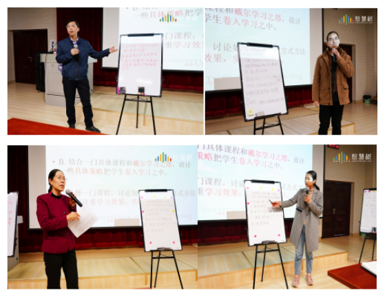 首先,庞海芍老师用“以学生为中心”的前置调查导入主题,以此了解与会人员对以学生为中心理念和策略的理解。随后又从大学课堂的一些常态现象引发在座教师对“什么是以学生为中心”这一问题的思考。她结合自身学习工作经历同与会教师共同探讨了“以学生为中心”的教育理念与教学策略,让大家围绕自己印象深刻的课堂、结合自己讲授课程中如何给学生设计好的问题等话题开展激烈的小组讨论,通过探讨、交流、分享来加深对“以学生为中心”教育理念的理解。庞老师指出,以学生为中心有三个维度:以学生发展为中心;以学生学习为中心;以学习效果为中心,教师要适当运用多种以学生为中心的策略来了解、认识并熟悉学生的基础、背景和学习风格,适应学生发展水平和状态,采取各种措施把学生引入学习之中,实现从灌输知识到建构知识的转变。